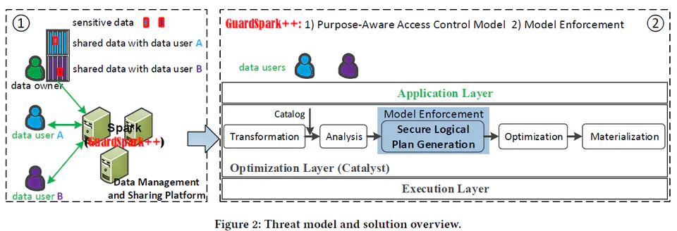 提出的面向数据共享分析的细粒度访问控制模型(即GuardSpark++、SparkAC),有效确保共享数据中的敏感信息可以被计算分析但无法被可视化,突破了隐私计算在使用层面的“可用不可见”难题,拓展了现有以同态加密、可信计算等为主的隐私计算技术,开辟了隐私计算研究领域的新方向。